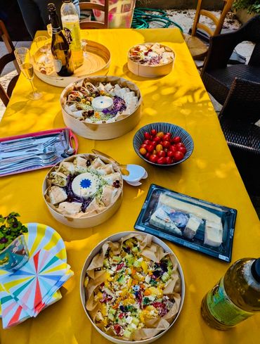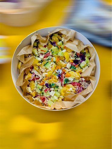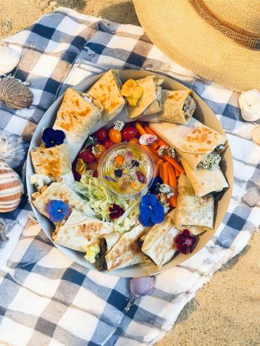 Toutes les boîtes WRAPINNIS® sont accompagnées d'une sauce au choix : baba ganoush ou houmous, de légumes frais et de fleurs comestibles.